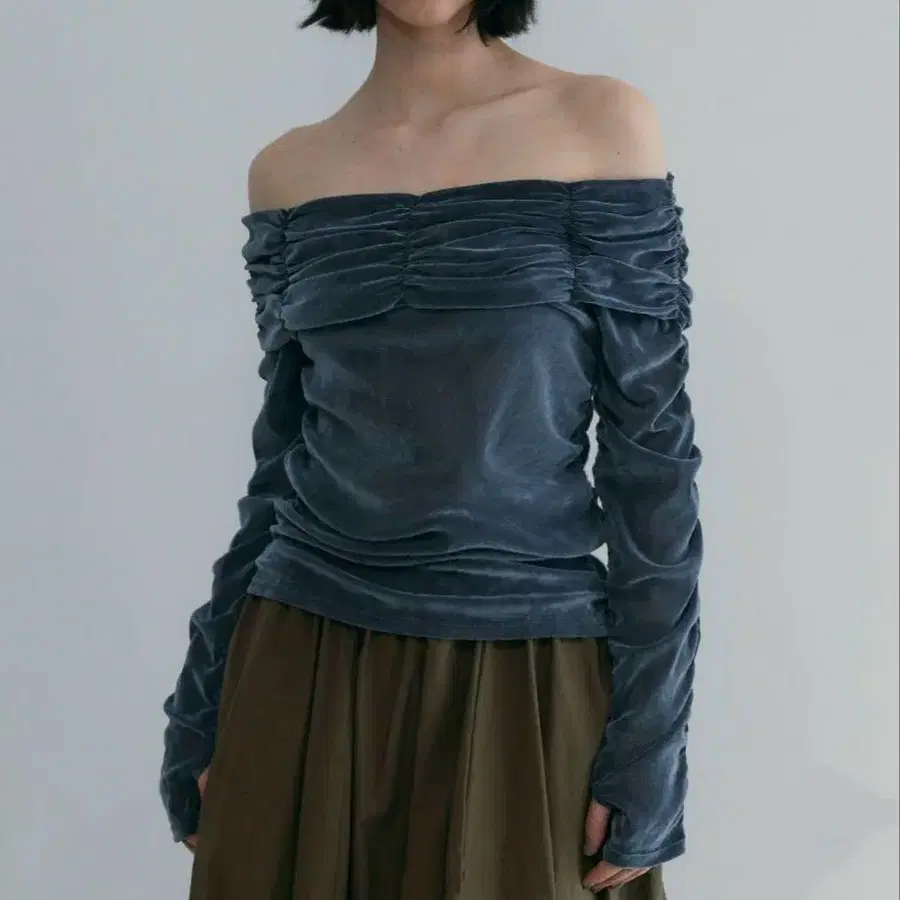 휘핑 크림 같은 개더 디자인이 데콜테를 아름답게 돋보이게 하는 오프숄더 상의.