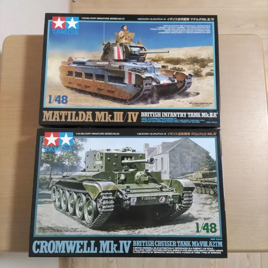 ★ 타미야의 1/48 밀리터리 미니어처 시리즈 No.72 영국 보병전차 마틸다 Mk.III/IV 프라모델 키트입니다. 스케일은 1/48, 전체 길이는 127mm입니다. 제2차 세계 대전 중 북아프리카 전선에서 활약했던 영국군의 보병전차를 재현했습니다. 두꺼운 장갑과 독특한 모양의 포탑, 차체 측면의 장갑 스커트 등 육중한 스타일이 특징입니다. 독일군의 전차포를 뚫리지 않아 '사막의 여왕'이라고 불렸습니다. 조립, 페인팅이 필요합니다. 참고 가격은 2,090엔입니다. ★ 타미야의 1/48 스케일 [ 영국 순항전차 크롬웰 Mk.IV ] 프라모델 키트입니다. 제2차 세계 대전 후기에 영국 기갑부대의 주력이 되었던 전차를 재현했습니다. 전체 길이 140mm의 플라스틱 모델 조립 키트입니다. 무게감이 넘치는 다이캐스트 섀시를 채용했으며, 궤도는 직선 부분을 일체형 부품으로 한 연결 조립식입니다. 노르망디 상륙 작전 이후 북서 유럽 전선에서의 마킹 3종이 부속되어 있습니다. 참고 가격은 2,090엔 (세금 포함)입니다.