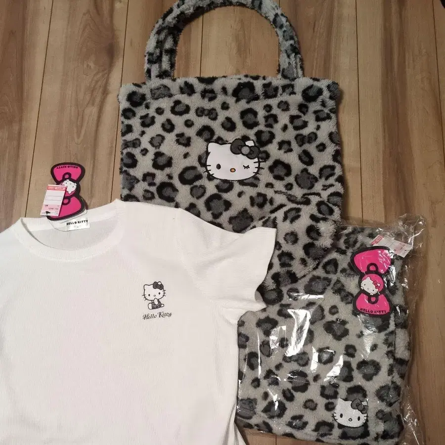 헬로키티 LL 레오파드 무늬 토트백, 하프 팬츠, 반팔 셔츠 3종 세트