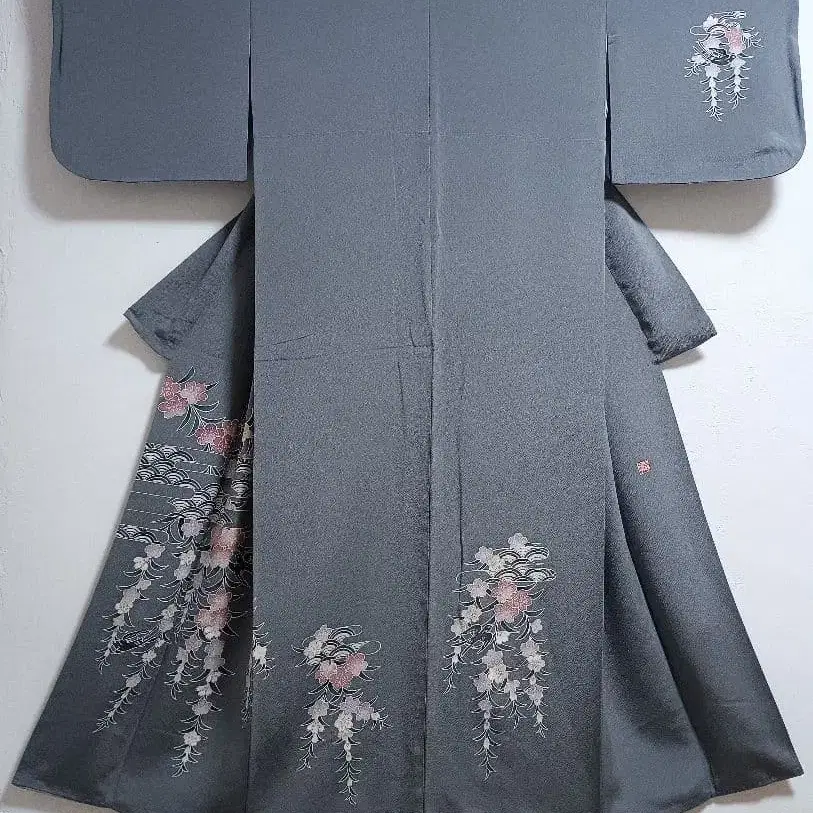 호몬기 순수 실크 이중 기모노 크레이프 원단 블루 그레이 벚꽃