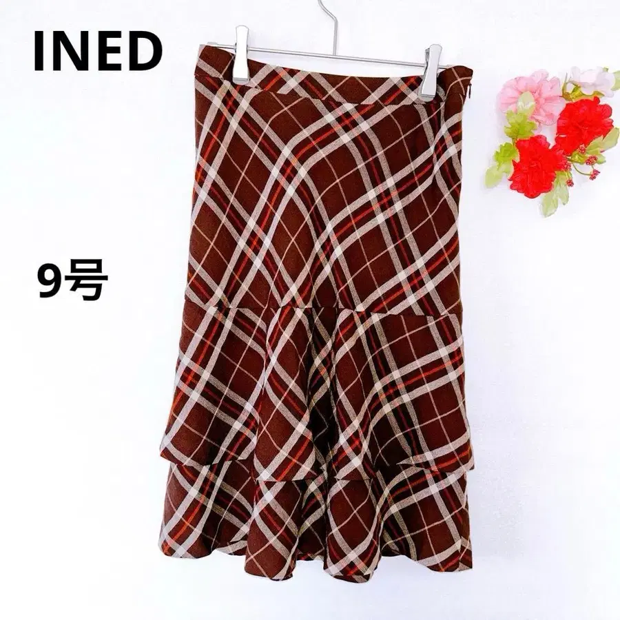 이네드 플레어 스커트 체크 무늬 티어드 브라운 갈색 타이트 9호