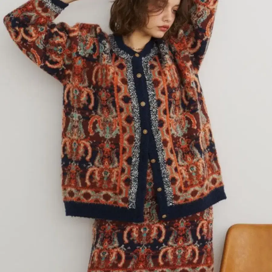 [ 새상품 ] Unitage 부클레 총 패턴 자카드 니트 가디건 셋업