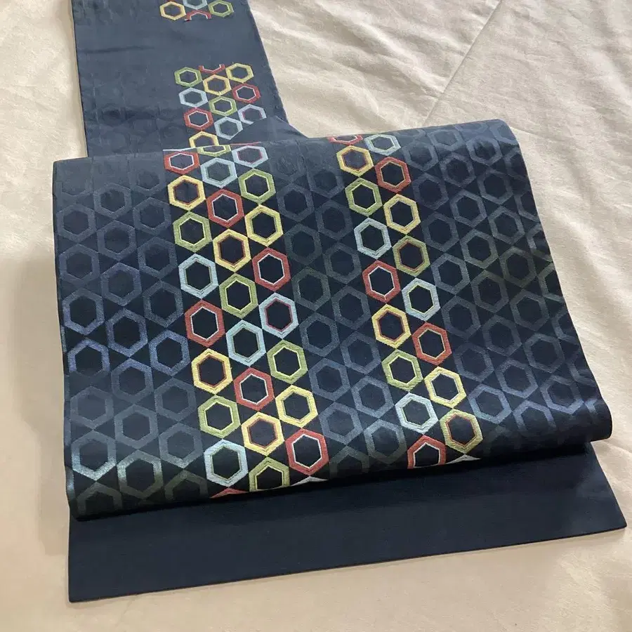 나고야 오비 9촌 블랙 베이스 육각형 무늬 순수 실크 당초직