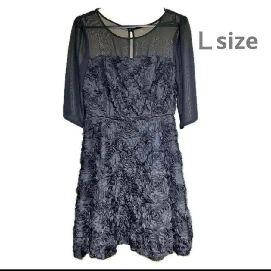 상의 부분과 스커트 부분은 플라워 레이스로, 소매와 데콜테 부분은 비침이 있는 쉬폰 소재로 되어 있습니다.