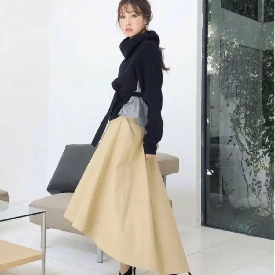 터틀넥 블랙 스웨터 허리 벨트 포함 체크 무늬 니트