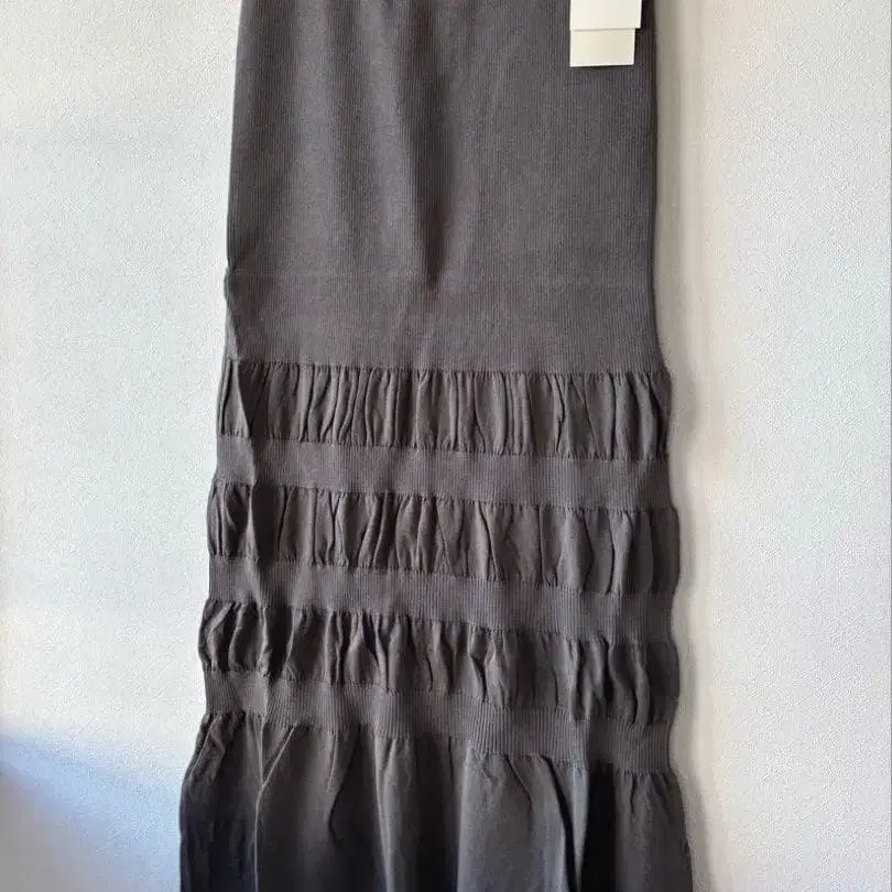 니트 직물을 바꾸는 테크닉으로, 시어한 느낌과 울퉁불퉁한 실루엣을 낸 니트 스커트입니다.
