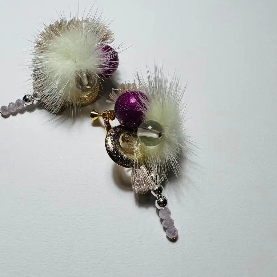 부드러운 퍼와 태슬이 부드러운 인상을 주며, 유리 비즈의 반짝임이 귀가에 적당한 화려함을 더합니다.