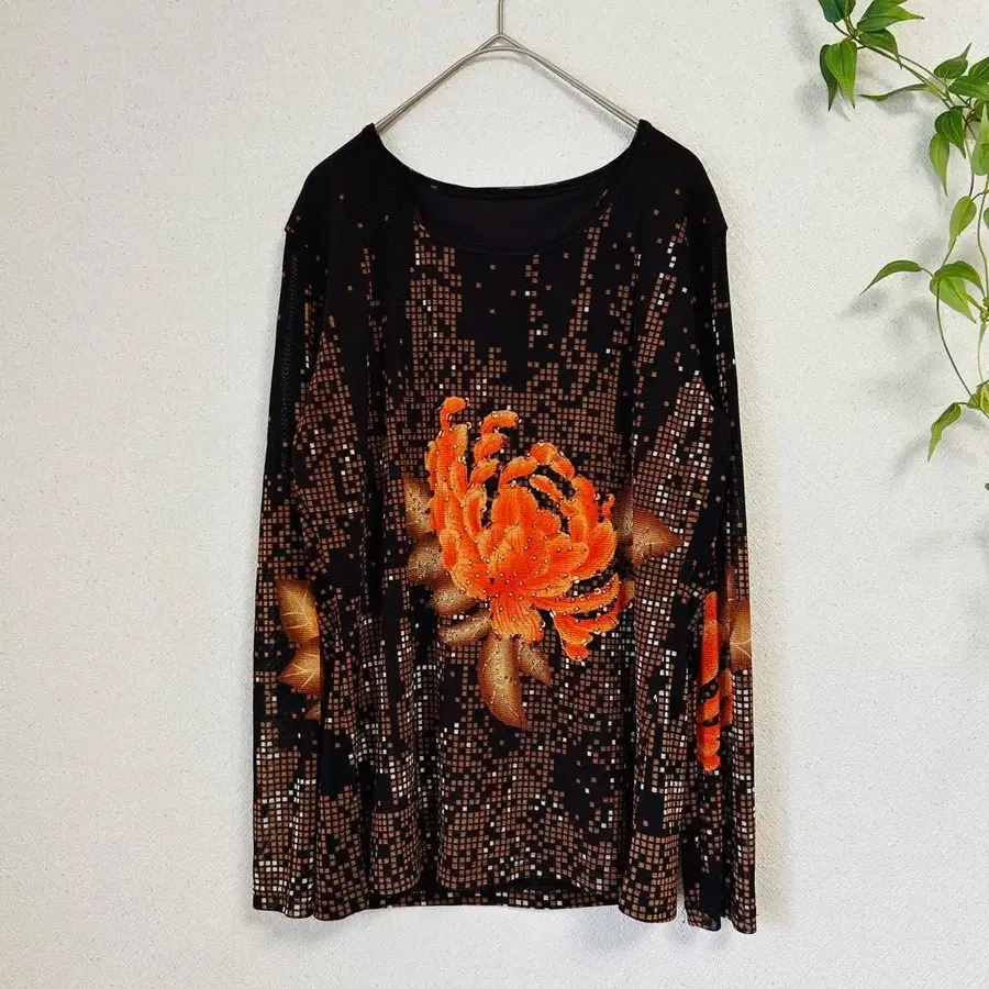 럭셔리 스팽글 파워넷 티셔츠 M~L 국화 화려한 스트레치 올 패턴