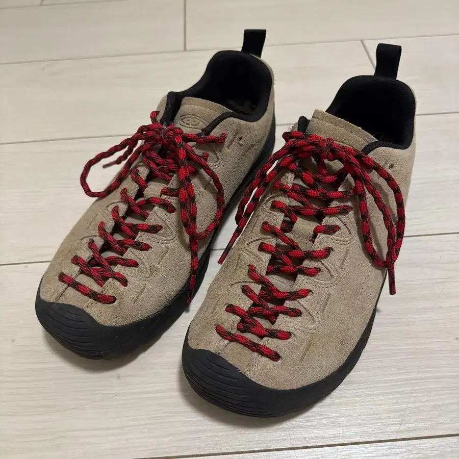 베이지 스웨이드 스니커즈 빨간 신발끈