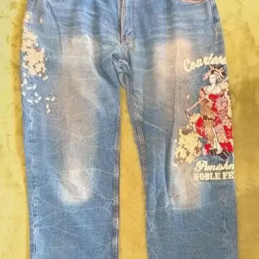 불구대천 데님 팬츠 일본풍 패턴 자수 초와이드 w40