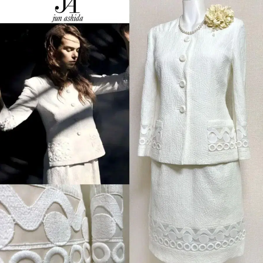 ◆ 탄탄한 마감의 일본제입니다. 부풀린 직조 자카드의 고급스러운 질감, 산뜻한 인상의 화이트 슈트입니다. 재킷의 소매와 포켓, 스커트의 밑단에 적용된 디자인이 특징이며, 둥근 디테일과 투명감이 부드러운 분위기를 자아냅니다. 노카라 재킷은 사각 넥라인이 목선을 깔끔하게 연출합니다. 어깨에는 개더가 더해져, 풍성한 여성스러움을 연출합니다. 예쁜 라인의 타이트 스커트와 함께 화려한 세레모니, 캐주얼한 장면에도 다양하게 연출할 수 있습니다.