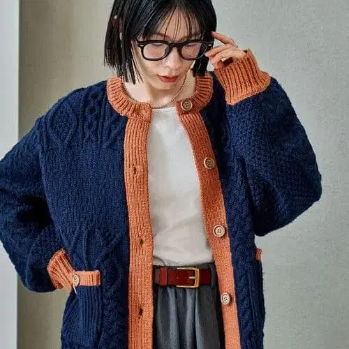 프릭스스토어 패치워크 케이블 배색 니트 가디건 네이비