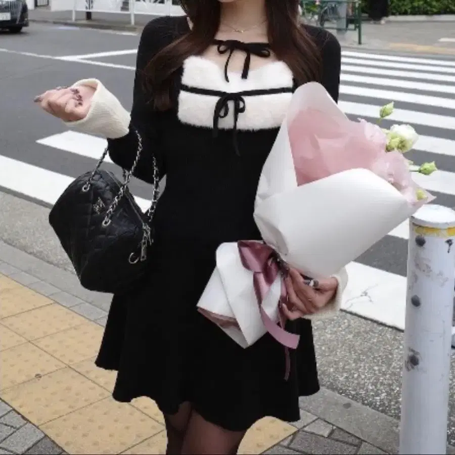 Darich 리본 퍼 플레어 니트 미니 원피스
