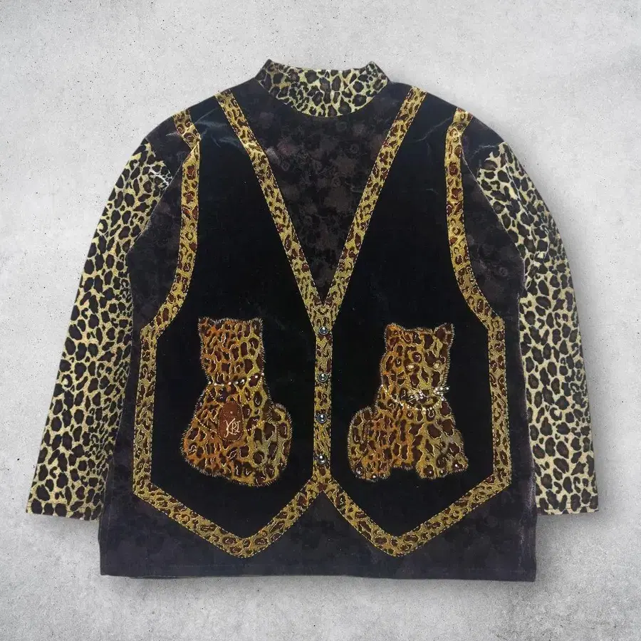 앞이 열리는 타입이 아닌 풀오버 타입입니다. 앞뒤에는 레오파드 무늬의 레오파드가 장식되어 있어 위트와 개성이 있는 한 벌입니다. 몸통 부분은 기모감이 있는 벨로아 느낌의 소재로, 코디네이트의 주인공이 되는 디자인입니다.