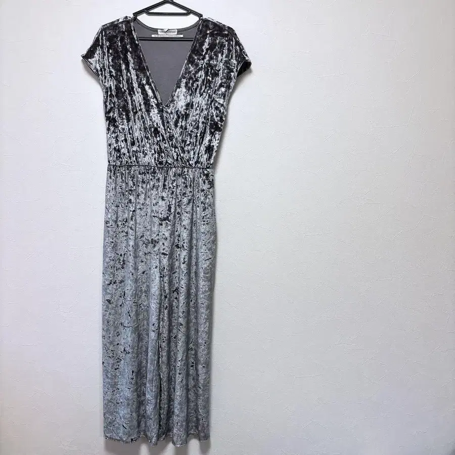 자동 번역되었어요. 원문보기그레이 벨벳 소재, 슬리브리스 디자인의 롱 원피스.