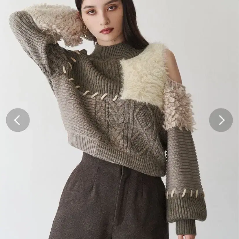 MURUA 마테리얼 MIX 숄더 오픈 니트 카키 신상