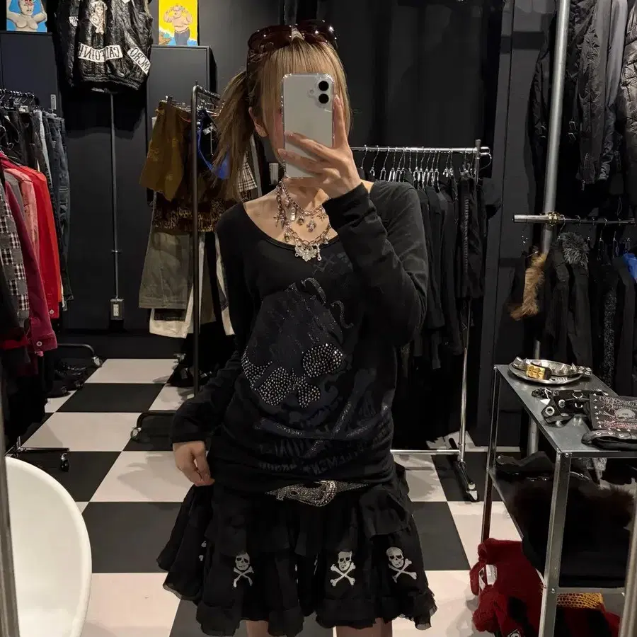 그런지 Y2K 해골 라메 긴팔 티셔츠 반짝이는 펑크