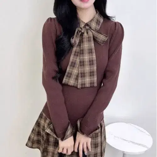 INGNI 체크 무늬 보타이 셔츠 도킹 니트 원피스