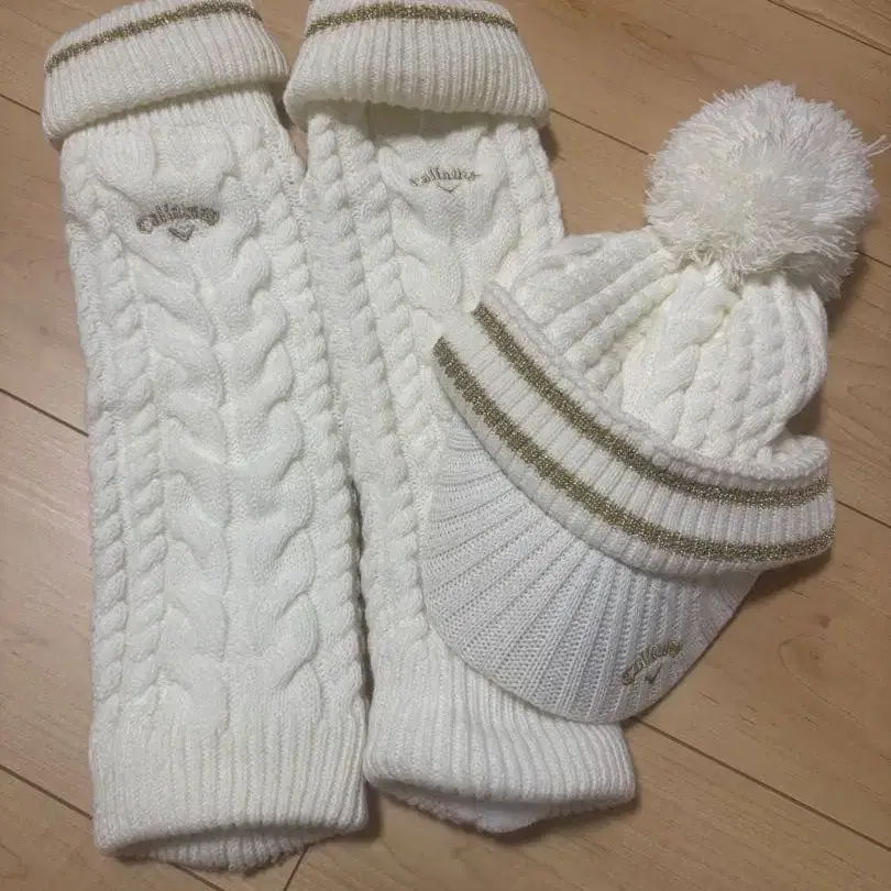 새상품급 화이트 케이블 짜임 레그 워머와 니트 모자 세트