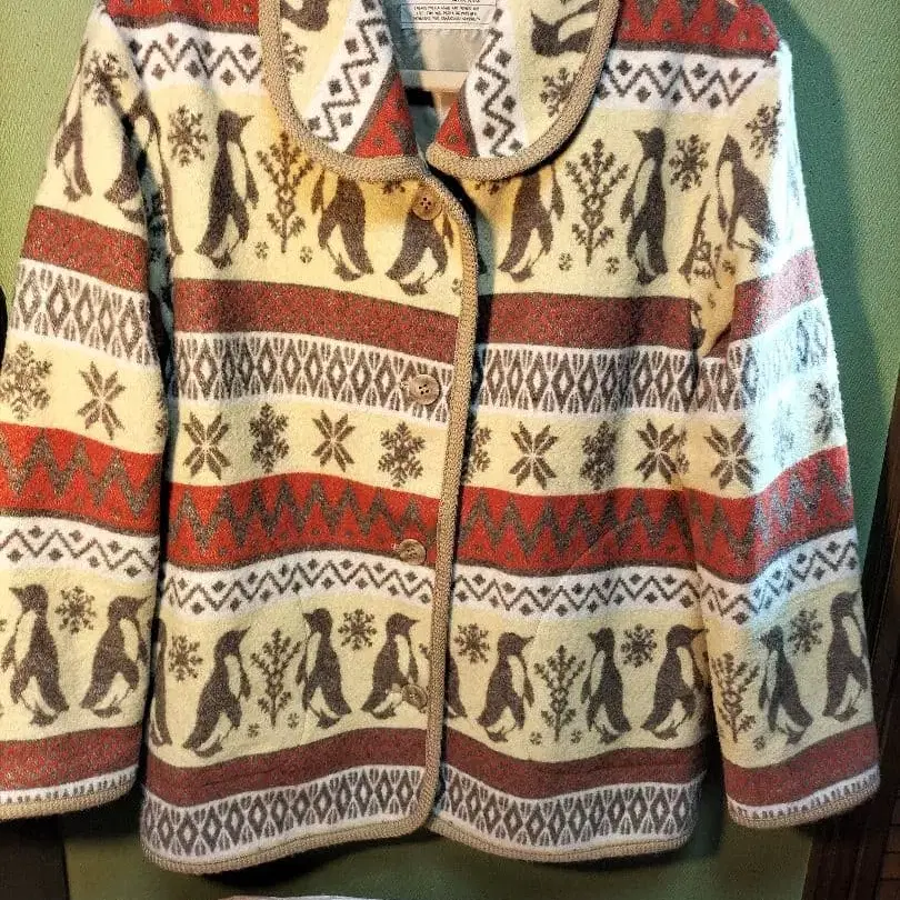 morle up의 퀼팅 자켓 크림색 바탕에 펭귄 무늬