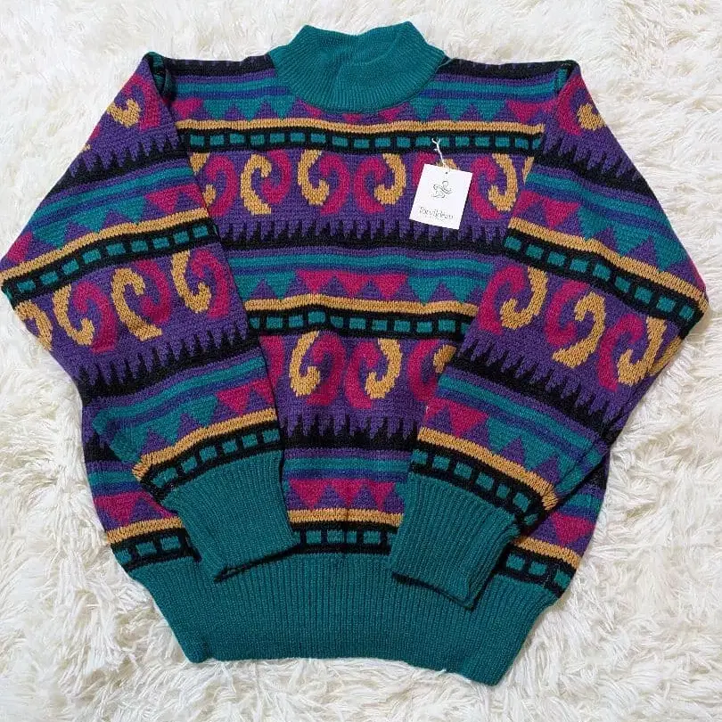 기하학 패턴의 터틀넥 니트, 멀티 컬러로 개성 있는 디자인.
