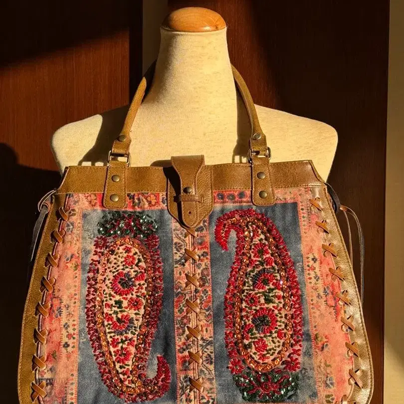 페이즐리 자수 토트백 브라운 비즈