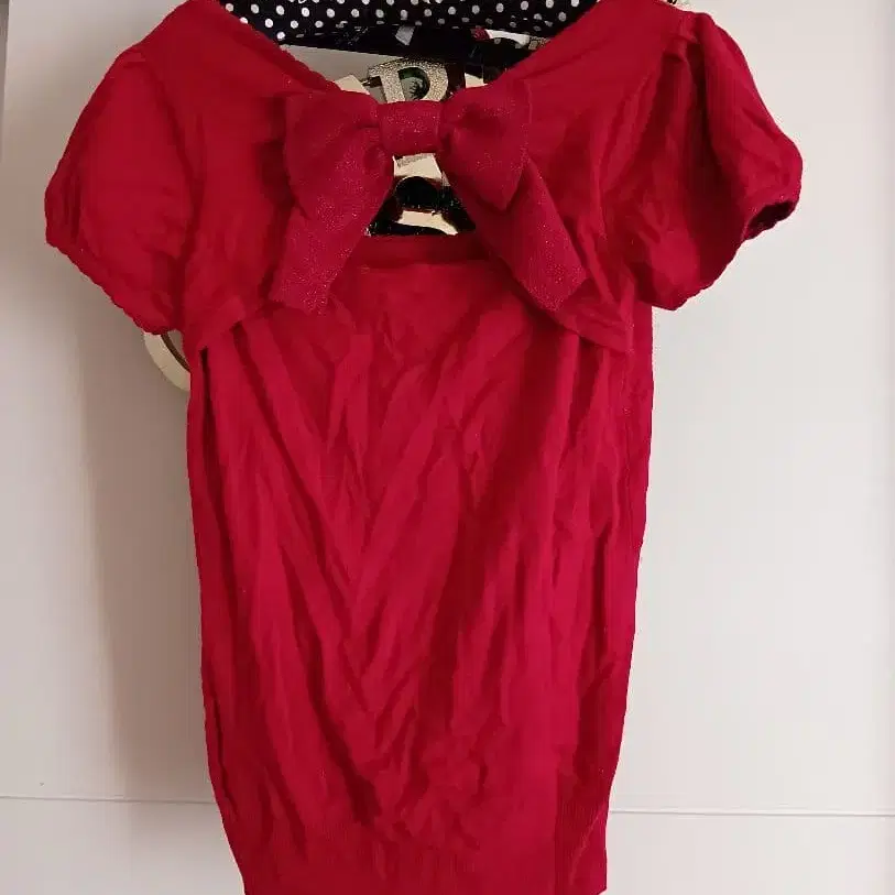 빨간색 백 라메 리본 포함 반팔 상의 바이바이