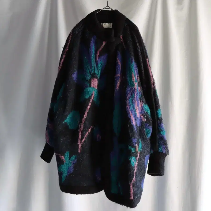 블랙 베이스의 바디에 꽃을 모티브로 한 추상적인 패턴을 대담하게 배치한 플로럴 니트. 사실적인 꽃무늬가 아닌, 윤곽을 흐린 유기적인 표현이 사용되어 달콤함을 느끼게 하지 않는 모드적인 분위기가 돋보입니다. 터콰이즈, 퍼플, 핑크를 포인트로 한 배색도 90s~00s 특유의 분위기를 느끼게 하는 완성입니다.