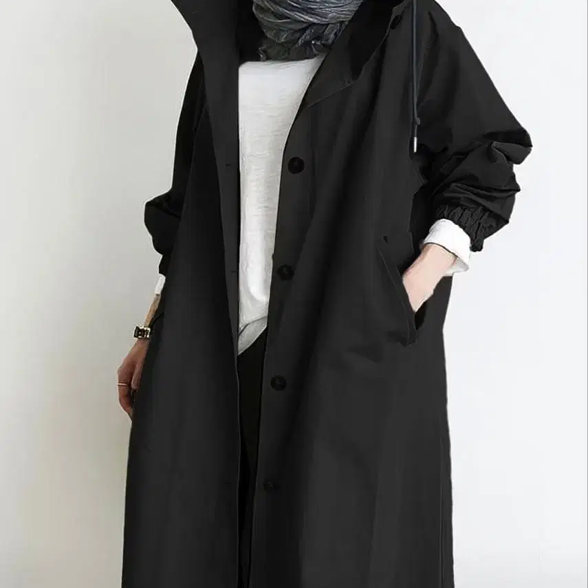블랙 후드 부착 롱 코트