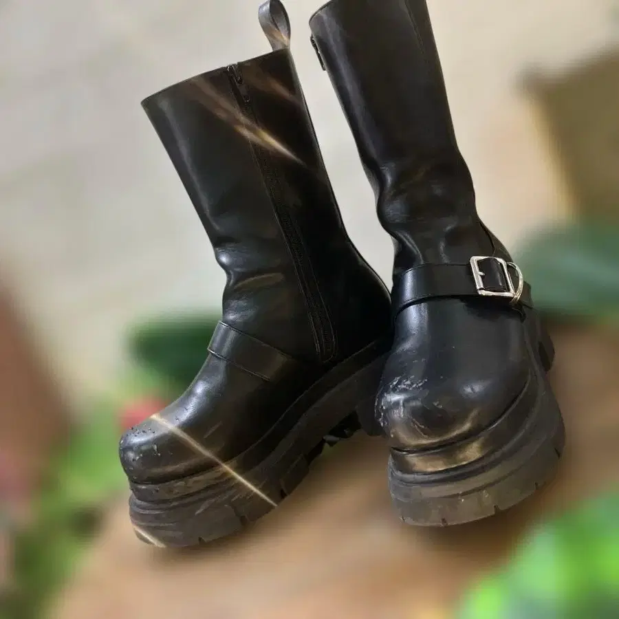 블랙 가죽 통굽 롱 부츠