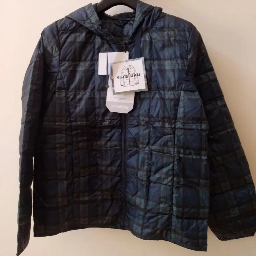 택 포함 새상품 serafuku 후드 부착 다운 자켓 네이비 계열 체크