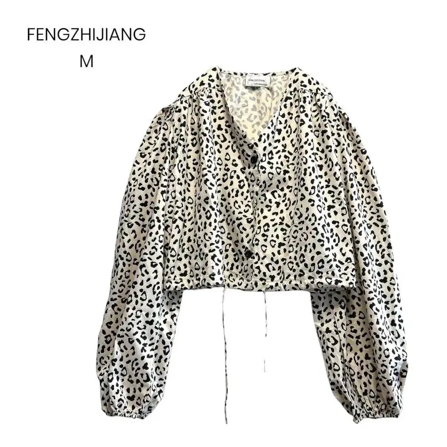 레오파드 레오파드 무늬 블라우스 크롭 볼륨 소매 M 한국1268