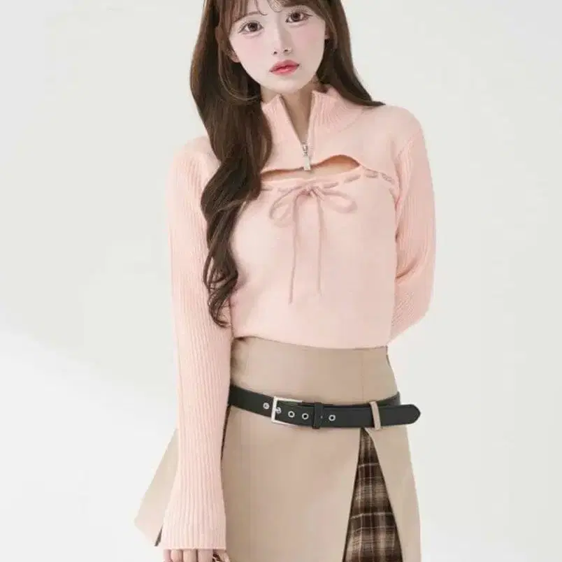 택 포함 새상품 다리치 스티치 리본 오픈 니트탑 핑크