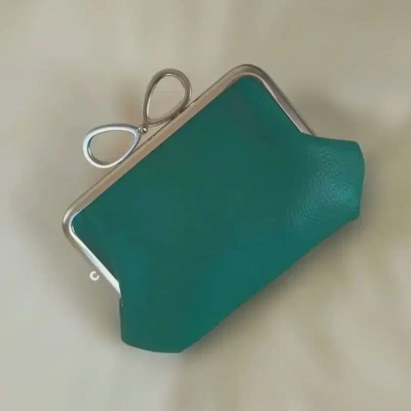 모자 가마구치 지갑 (12cm) 그린 가죽 리본 장석 소프트 실버