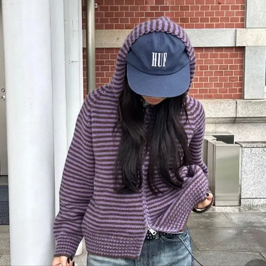 보더 니트 더블 지퍼 후드티