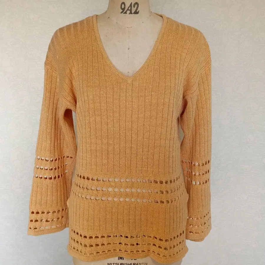 오렌지 V넥 시스루 니트 긴팔 스웨터