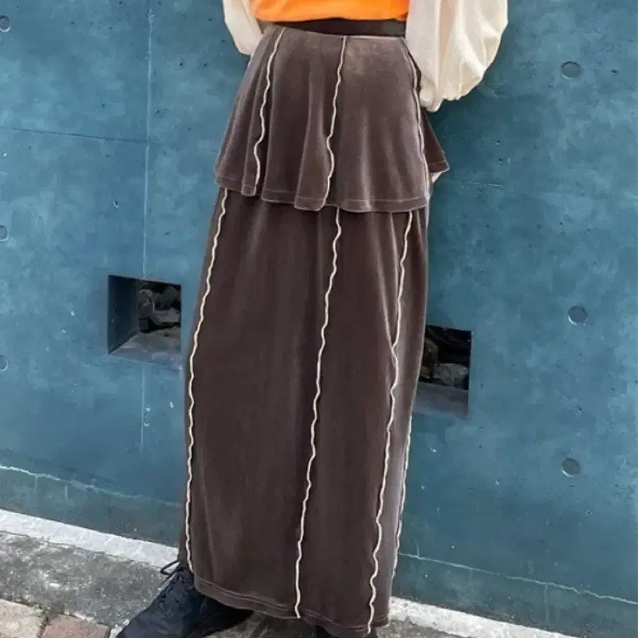 JUNOAH 배색 메로우 벨로아 레이어드 스커트 롱 스커트