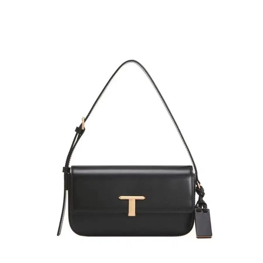 심플하고 엘레강트한 블랙 가죽 숄더백, 골드 금장 장식이 악센트.