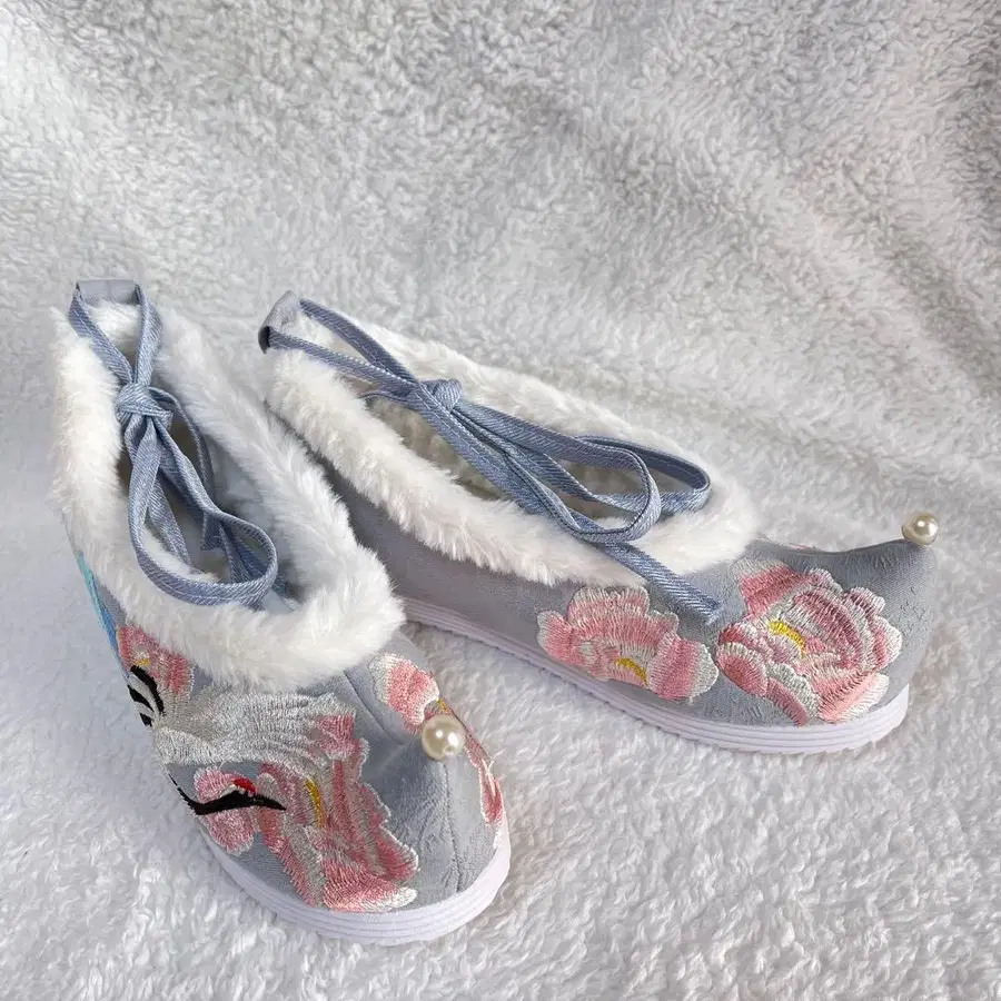 한푸 신발: 펄과 꽃무늬 자수가 놓인 그레이 색상의 한푸 신발 스타일: 중국 전통 한푸 스타일, 민족 의상 스타일. 디자인: 발가락 부분에는 펄, 어퍼에는 핑크와 화이트, 블루 등의 꽃 자수가 특징입니다. 소재: 안쪽은 화이트 퍼 소재로 뒷면이 덧대어져 있어 겨울 또는 가을 겨울용으로 적합합니다. 클로징: 얇은 라이트 블루 색상의 신발끈으로 묶는 타입입니다. 사이즈: 표기 36 (22.5cm 상당) 바닥 부분 실측치수: 세로 23cm, 가로 7.5cm, 힐 높이: 3.5cm 인솔 포함 (약간의 오차는 양해 부탁드립니다) *퍼 소재로 따뜻하여 실내에서 사용하기 위해 Amazon에서 구매했으나 사이즈가 맞지 않아 판매합니다. 구매 후에는 정성껏 포장하여 발송해 드립니다. 651219165