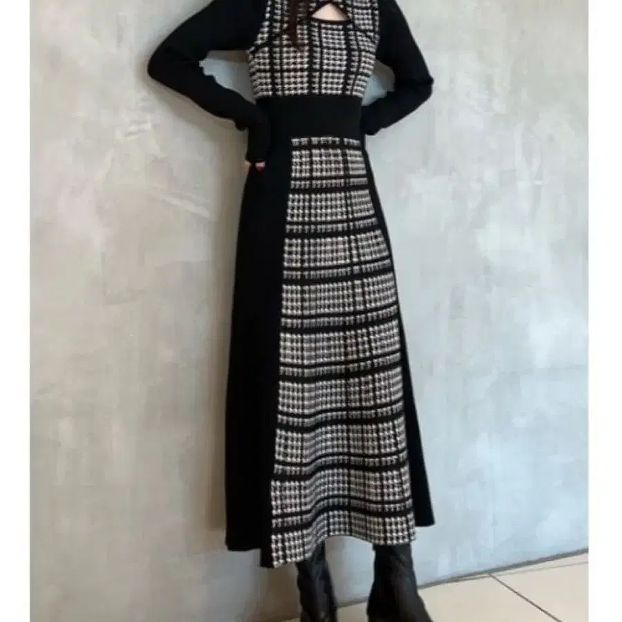 rienda 2WAY 롱 슬리브 하운드투스 체크 플레어 니트 원피스