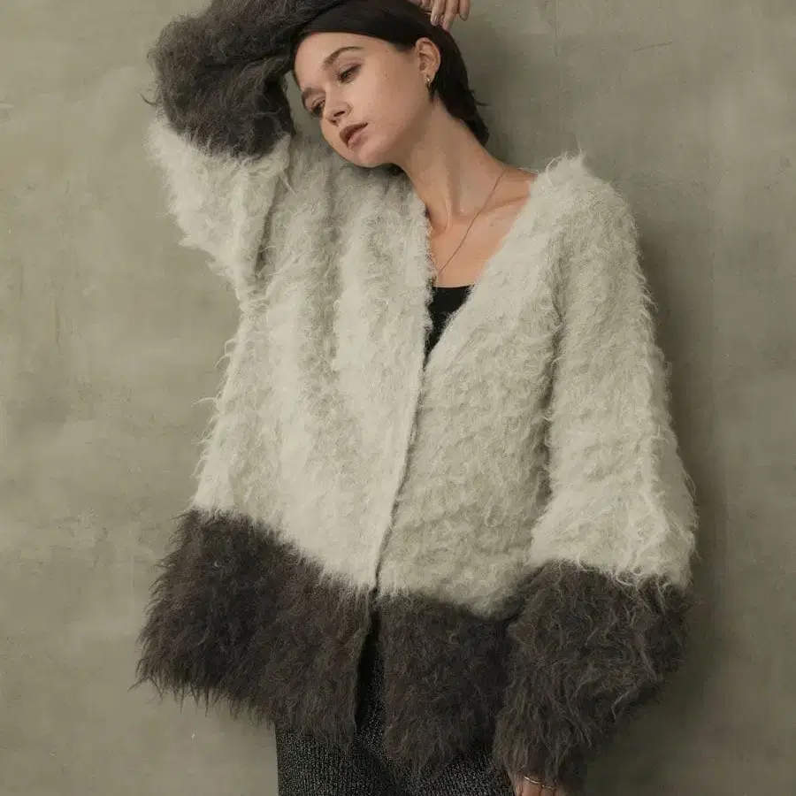 바이컬러 몬스터 샤기 니트 루즈 V넥 가디건