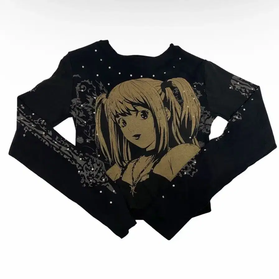 지뢰계 Y2K 애니메이션 걸 롱 T 라메 스톤 부착 블랙 상의