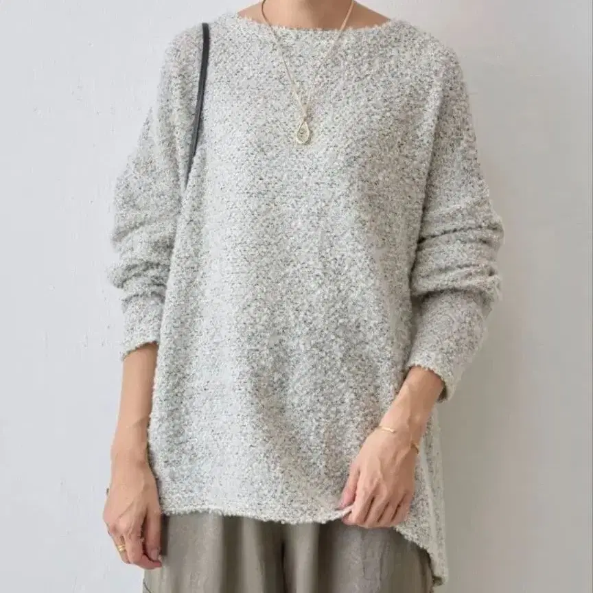 ■ 아이템라이트 그레이에 블랙이나 화이트 실을 믹스한 티셔츠. 몰사(モール糸)를 짜서 만든 신축성 있는 원단을 컷하여 봉제했기 때문에, 니트처럼 입으실 수 있습니다. 카라 부분이 느슨해서 셔츠 등 이너와 함께 입는 것도 추천합니다. 네프라는 실의 매듭을 살린 원단으로, 볼록한 느낌이 따뜻한 아이템입니다.