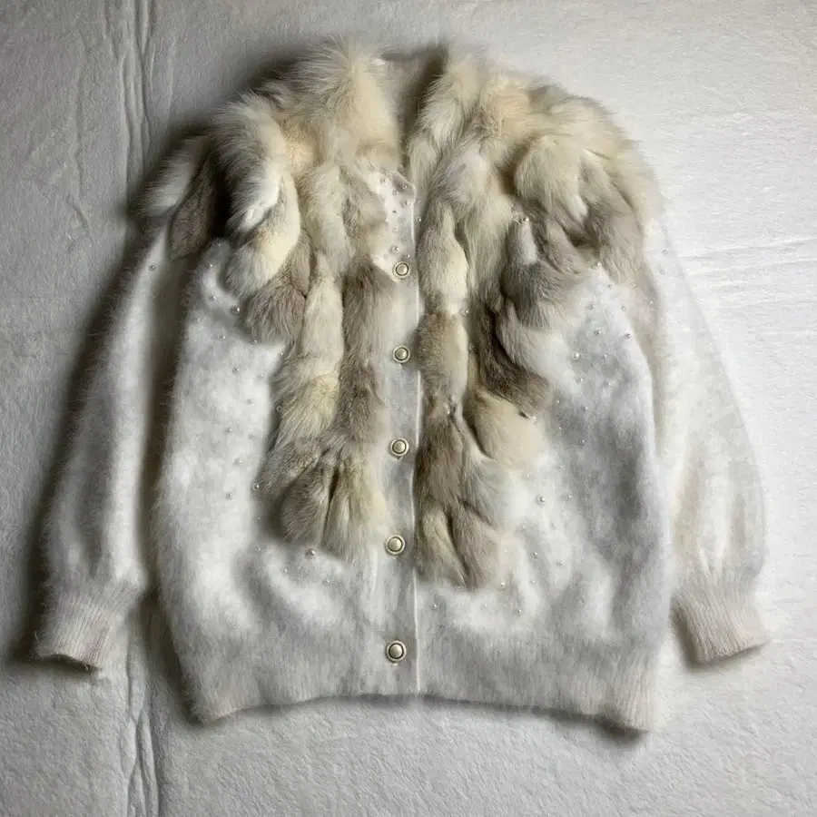 [ 니트 가디건 아이보리 퍼 비즈 복슬복슬 고급스러움 구제 의류 ]