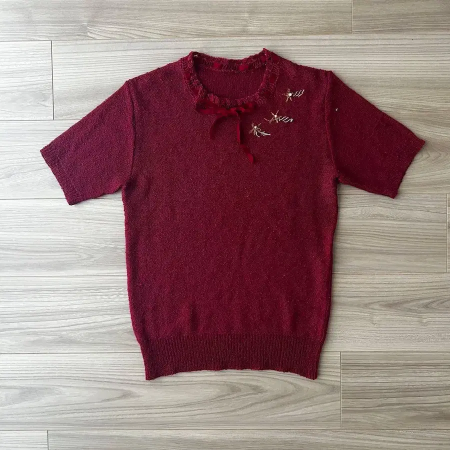 레트로 구제 의류 썸머 니트 반팔 옷깃 리본 펄 자수 와인 레드 셔츠