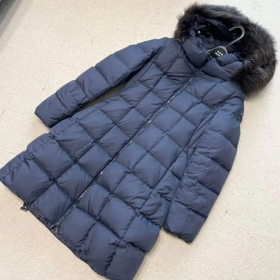 몸의 라인을 따라 흐르는 블록 스티치가 인상적인 롱 기장 다운 자켓.