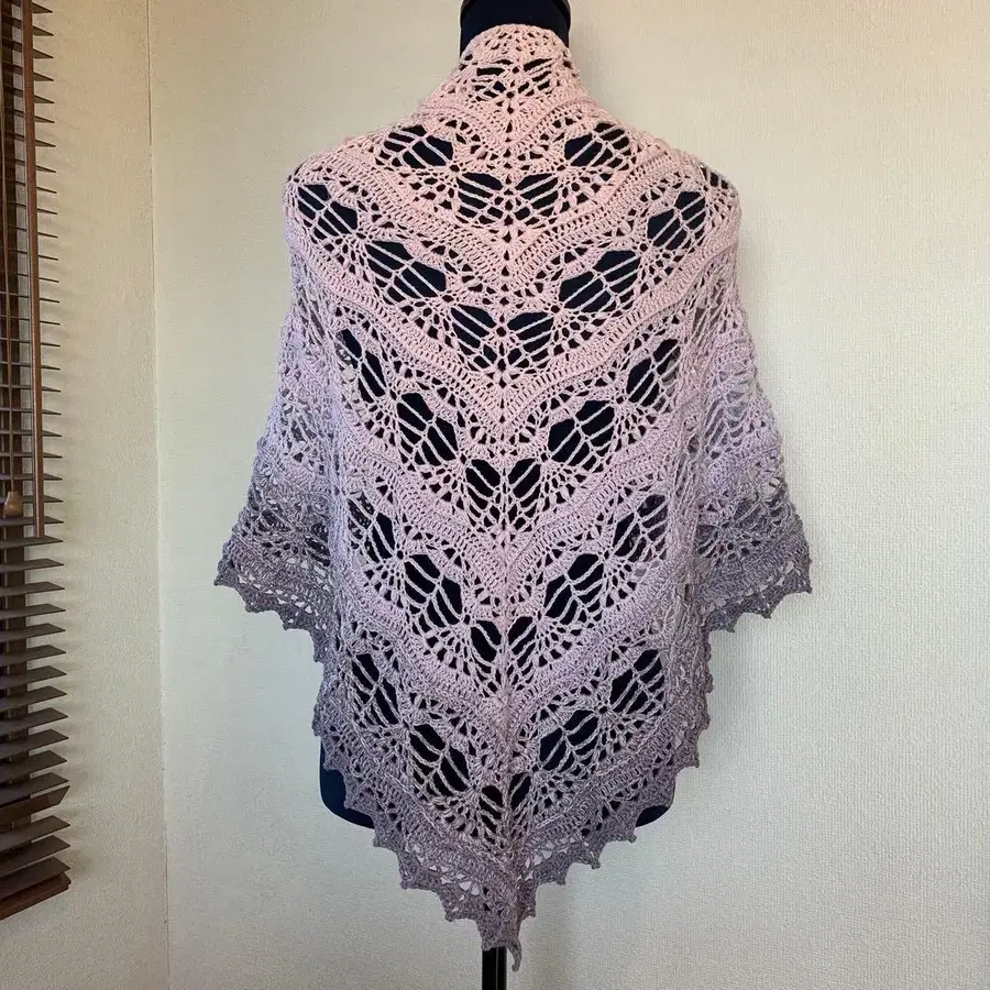 풍성한 시스루 무늬가 하트 무늬로 되어 있어 매우 귀엽고, 색상과 디자인 모두 화려하여 단번에 시선을 사로잡는 숄이 되었습니다.
