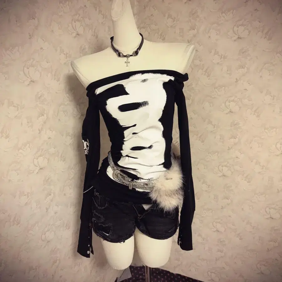 새상품 Y2K 오프숄더 티셔츠 블랙 화이트 헤이세이 갸루 펑크