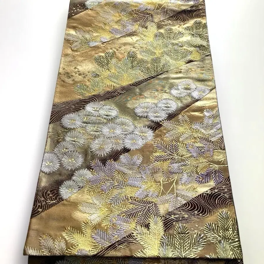 아름다운 골드 컬러 보라색 잎 무늬 후쿠로 오비