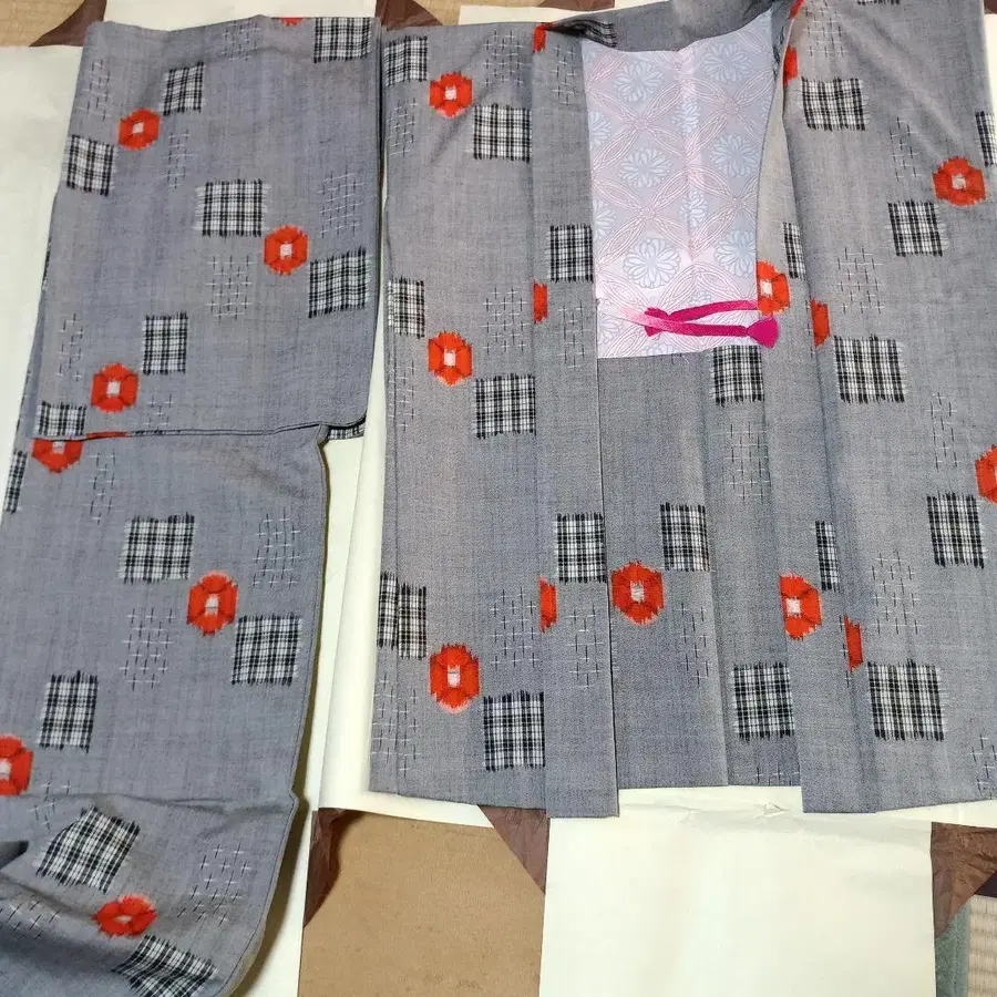 울 기모노와 겉옷 그레이 빨간색 블랙 무늬